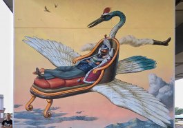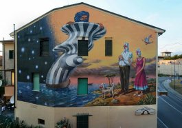 (Aleksei Bordusov) is one of the two artists from the famous Ucrainian duo Interesni Kazki (literally, Interesting Stories), founded in Kiev in 1999 when they were but teenagers; they were pioneers in writing in Est European countries and they slit up in 2016, after reaching their full artistic maturity. AEC, among the most important names in the whole world’s street art, invades the city with allegorical tales of surreal worlds in which light and warm colours give life to fairy-tale characters, even goofy sometimes, and to dreamland lanscapes in which time is suspended and shapes recurr, loosing their original meaning and acquiring new ones. From his fantasy erupt richly detailed universes, full of thoughtful features, originating from local tradition found where the artist is operating during his travels, and they grow up interacting with heterogeneous elements (like religion, mythology, cosmology, history, sci-fi) and reach their full achievement by bringing the spectator, by means of these impressions, to a reflection on more general and deep matters.